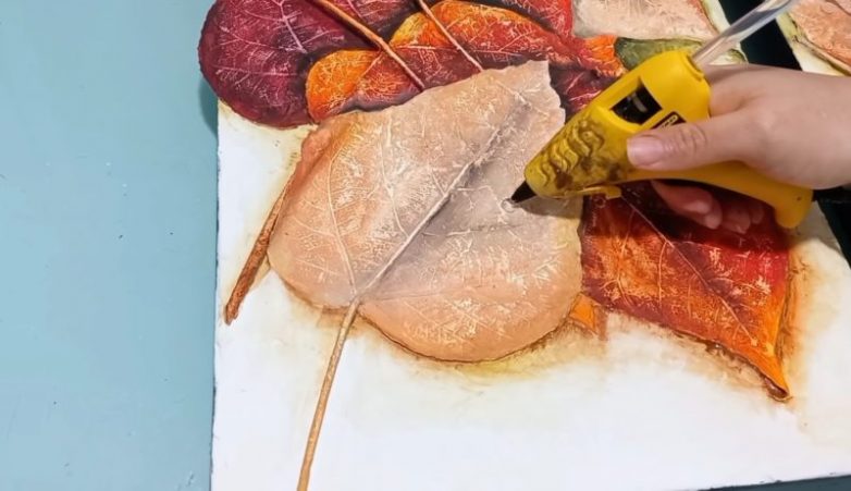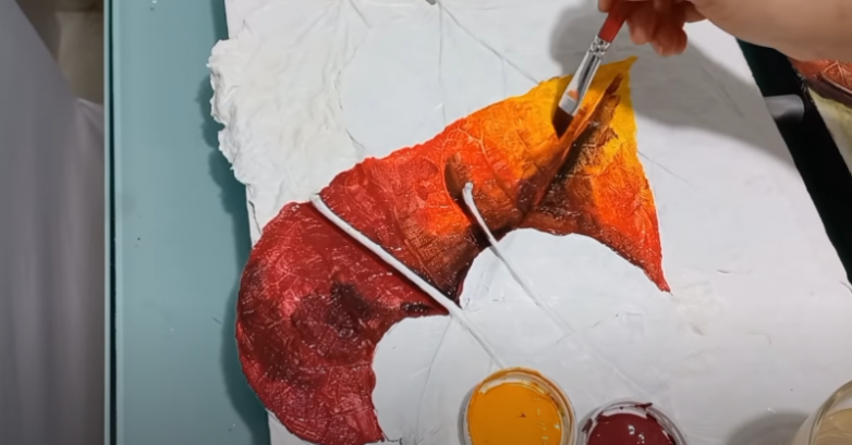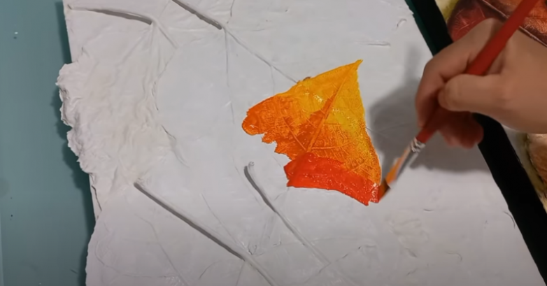 Когда гипс высохнет, можно переходить к раскрашиванию. Эффектней всего будет использовать в данном случае градиент, то есть плавный переход от одного цвета к другому. Для этого просто поэтапно, линиями покрасьте листья в разные цвета, например, оранжевый, красный, бордовый, а затем смешайте цвета на границе линий.