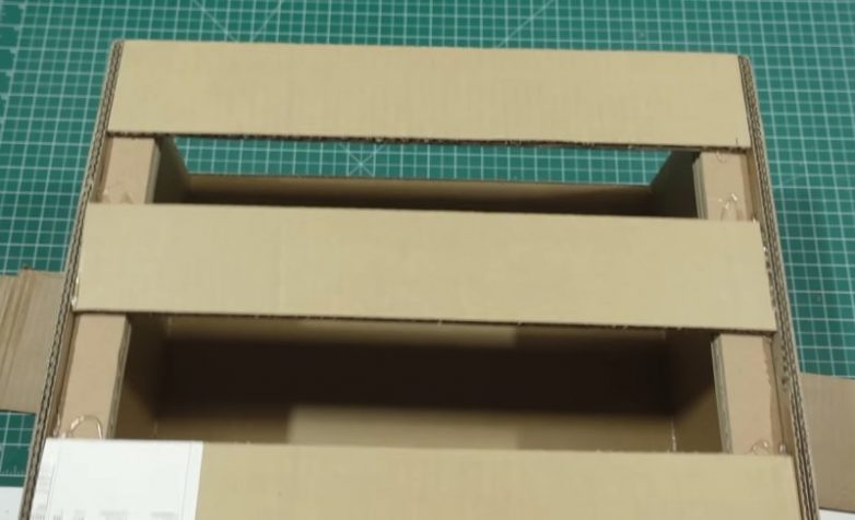 Далее нам необходимо подготовить остальные стенки тумбочки, для этого будем использовать гофрокартон. Из картона вырезаем заготовки необходимых размеров в нескольких экземплярах, склеиваем их между собой для того, чтобы получить более толстые и прочные стенки. Затем собираем заготовки в части будущей тумбы: корпус и выдвижной ящик.