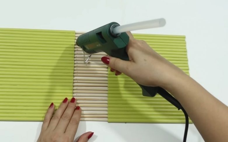 Затем можно добавить деревянный декоративный элемент, заодно и немного укрепив переднюю стенку ящика. Для этого между заготовками, полученными на предыдущем этапе, вставляем деревянные палочки. При необходимости фиксируем их при помощи клея.