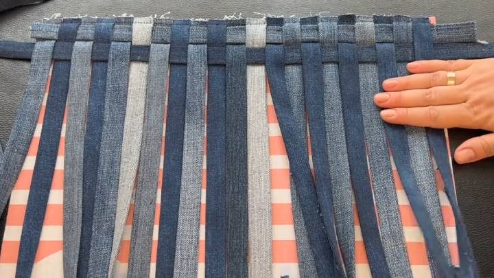 Теперь выложите ряд джинсовых полосок на ткани. Можно закрепить зажимами. Лучше — прошить на машинке первый ряд полос. Переплетайте, ряд за рядом, полоски.