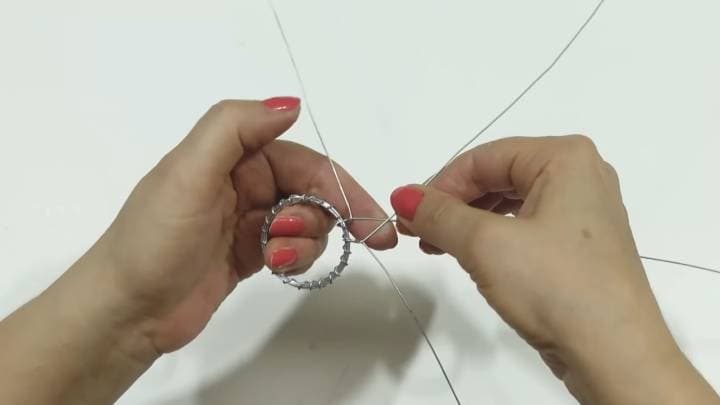 Теперь берите по одному отрезу тонкой проволоки, согнутой пополам, надевайте на кольцо и перекручивайте один раз, чтобы зафиксировать.
