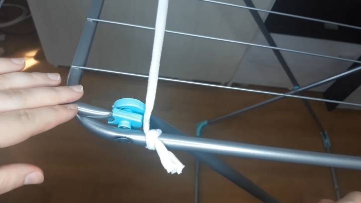Старую одежду нарежьте на полосы. Можно для этих целей и ткань купить, конечно, а потом — разрезать на полосы. К сушилке для белья привяжите чуть в натянутом виде полосу, завяжите с обеих сторон.