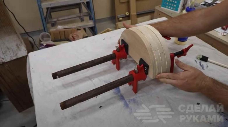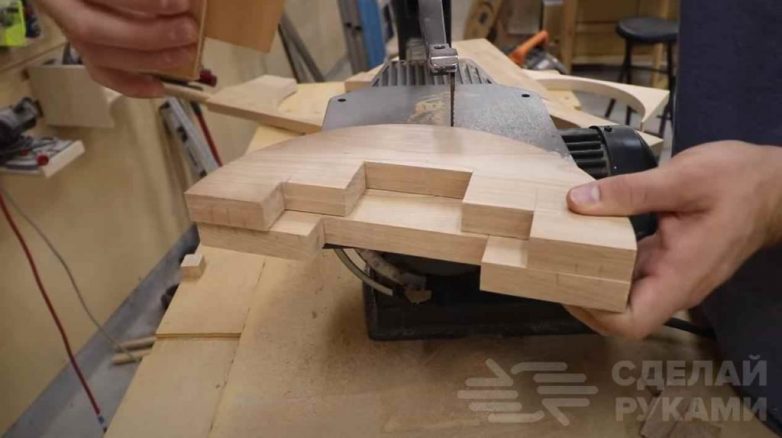 Первым делом с помощью циркуля размечаем на заготовках полуокружности. Вырезаем детали на ленточной пиле.