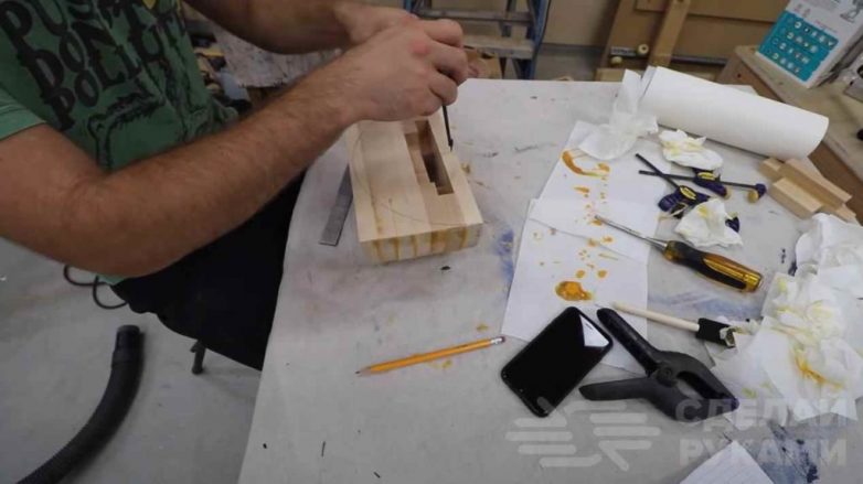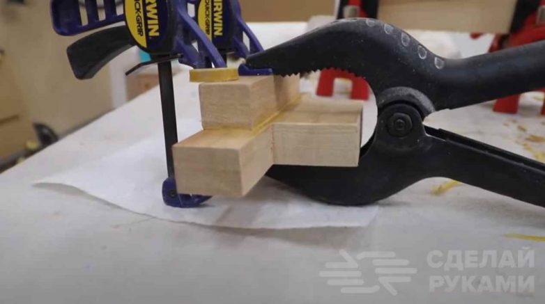 Отдельно склеиваем кронштейн, на который будет крепиться полка. Мастер использует две заготовки, которые были вырезаны ранее.