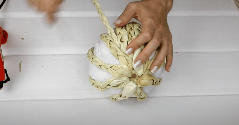 Далее приступаем к оклейке тыковки косичками. Для начала симметрично приклеиваем косички крест на крест сверху и снизу.