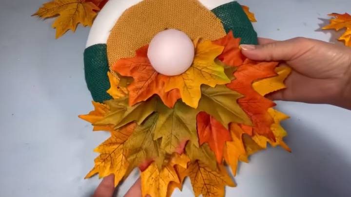 Дальше, слой за слоем, наклейте один на другой листья. В качестве носа выступит половинка пенопластового шарика, завернутого в носок.