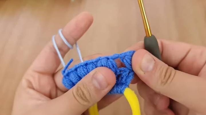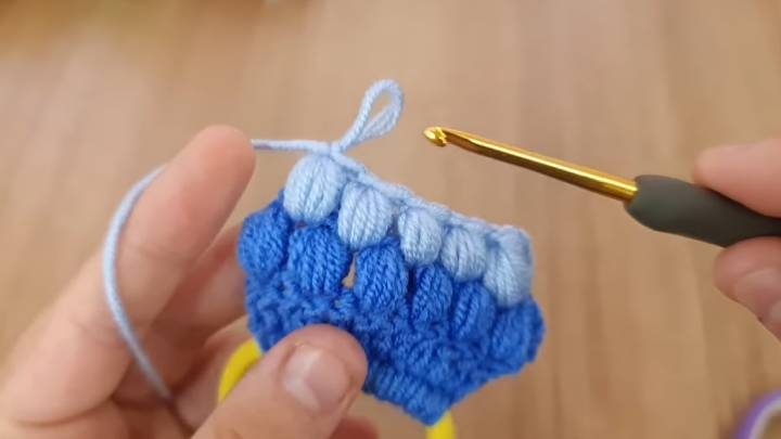 Обрежьте нить, присоедините пряжу нового цвета. Присоедините её между «шишечками» в предыдущем ряду, в самом начале.