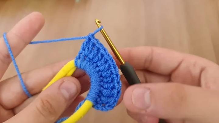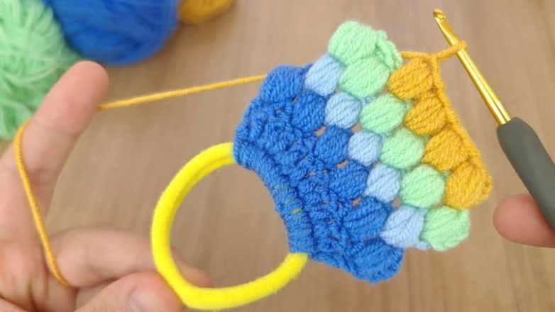 Завершайте вязание, присоединив последний ряд к той же резинке с обратной стороны. Лучше всего завершить таким же цветом, как и начинали. Наберите 3 воздушные петли, разверните вязание, сделайте накид, вставьте крючок между «шишечками» предыдущего ряда, провяжите столбик с накидом. Вяжите столбики с накидом до конца ряда (повторяется такое же вязание, какое было в самом начале).
