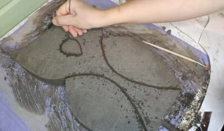 Даем заготовке немного подсохнуть, примерно в течение 2 часов. За это время цемент немного подсохнет и будет хорошо держать форму, оставаясь при этом пластичным. На этом этапе подготавливаем также бумажный трафарет контура будущей фигуры, по которому затем вырезаем заготовку из цемента.