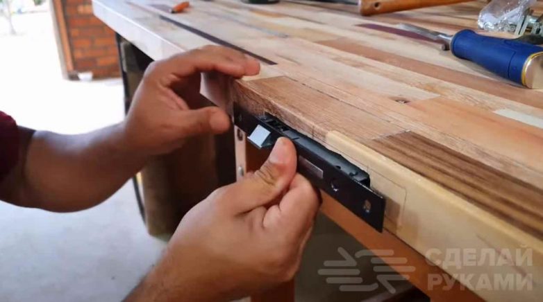 Далее в верхней и нижней части двери (с одной из сторон) автор устанавливает ответные части петель со штифтом, предварительно просверлив отверстия на требуемую глубину.