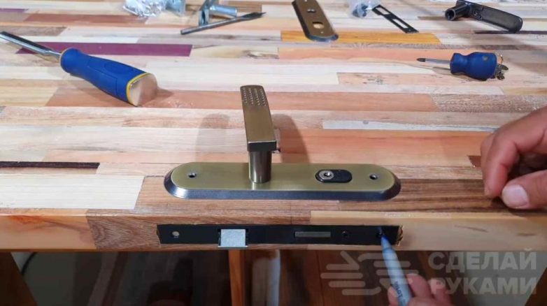 На следующем этапе необходимо будет врезать замок (для этого сначала выбираем паз в дверном полотне), потом устанавливаем дверную ручку с цилиндровым механизмом и декоративные накладки.