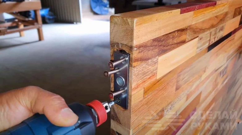 В данном случае у мастера нашлись в закромах деревянные бруски разного цвета, оставшиеся от прошлых проектов. Склеиваем их в щит нужного размера, чередуя разные цвета.