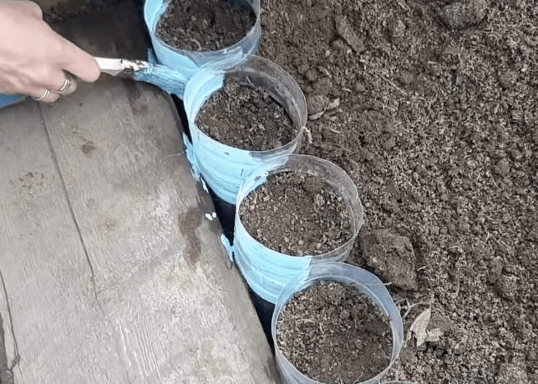 Для начала обрезаем достаточное количество бутылок одинакового диаметра по высоте. В каждой заготовке делаем по несколько боковых надрезов с небольшим отступом от дна. Это необходимо для того, чтобы излишки воды при поливе не скапливались внутри. Корням высаженных растений также будет куда прорости со временем.