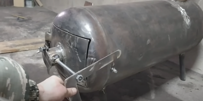 Дверца готова, осталось только приварить ручку, а также соорудить поддувало. В нашем случае оно сделано из небольшого среза стальной трубы и дверцы, закрепленной на вентиле.