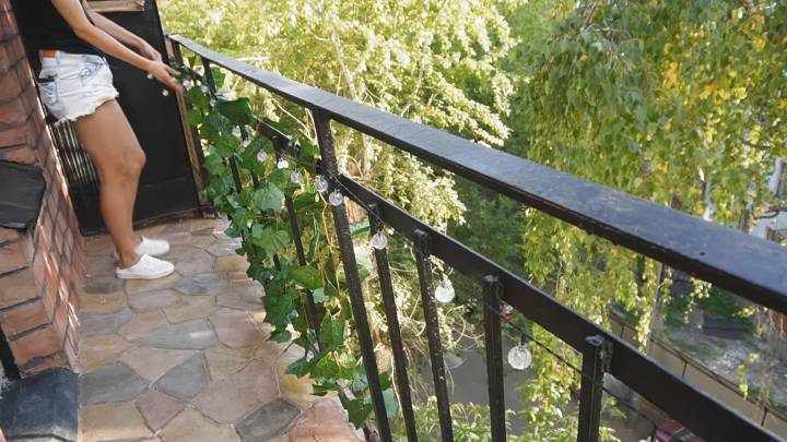 Далее, балкон можно украсить по собственному вкусу. В данном МК ограждение было задекорировано искусственной лианой и гирляндой, работающей от солнечной батареи.