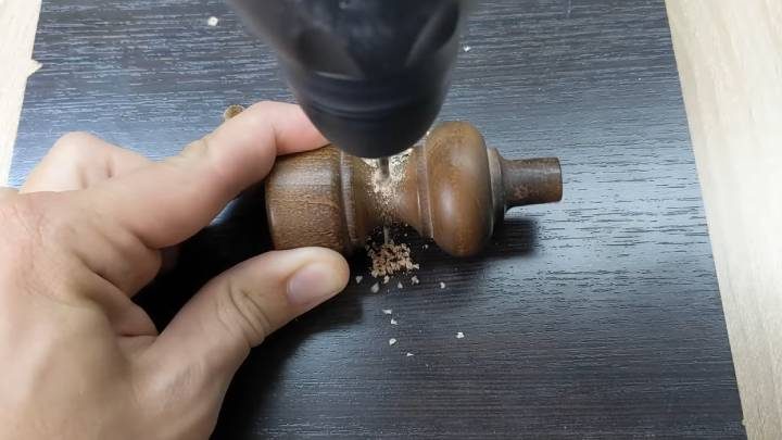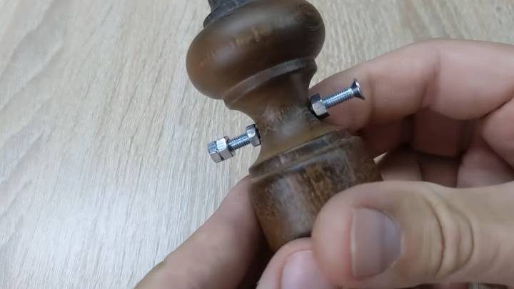 Снимите наконечник с карниза, ровно по центру просверлите сквозное отверстие. Вкрутите винт, зафиксируйте его гайками с обеих сторон.