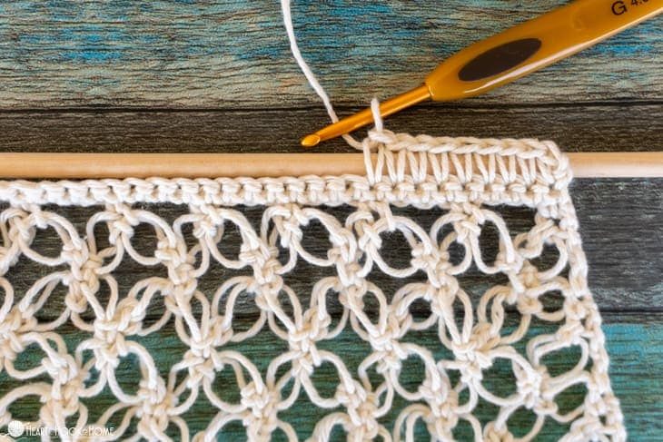 В следующем ряду необходимо сделать смещение, чтобы узор в готовом полотне лег шахматкой. В начале набираем 4 ВП для регулировки полотна по высоте, а затем вяжем 1 УС.