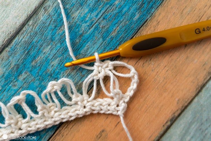 Делаем подъемную ВП, поворачиваем полотно и провязываем 1 СБН в верхушку одиночного УС. Дальше вяжем 8 блоков из 2-х УС, фиксируя их СБН в перемычку межу УС предыдущего ряда.