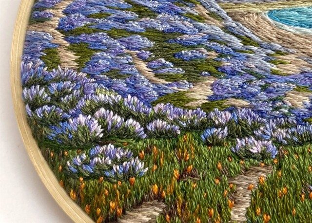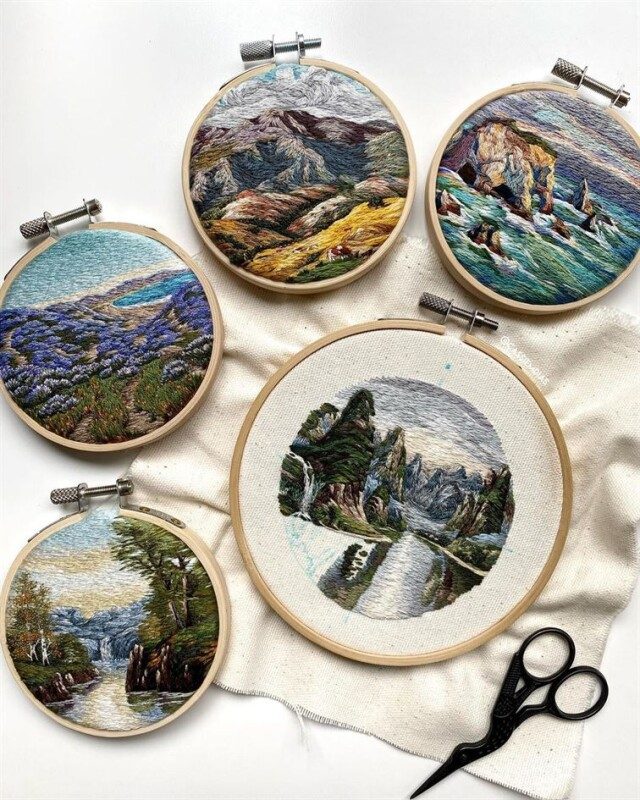 Кассандра Диас (Cassandra Dias) — рукодельница из Камарильо, штат Калифорния, США, которая сочетает французские узелки, атласные стежки и различную технику росписи нитками, создавая живописные пейзажи на пяльцах.