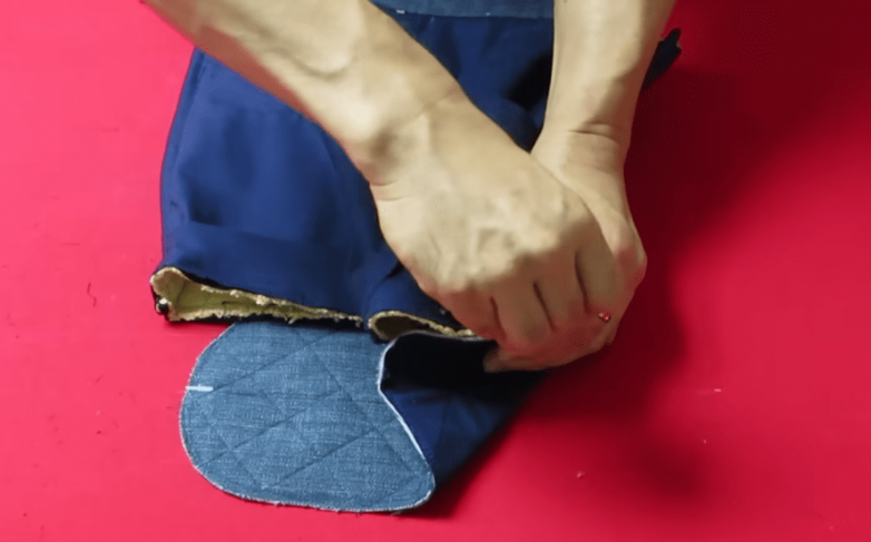 Совмещаем готовые детали подкладки с основным полотном по принципу изнанка к изнанке. Дополнительно фиксируем по периметру, а затем прокладываем строчку.