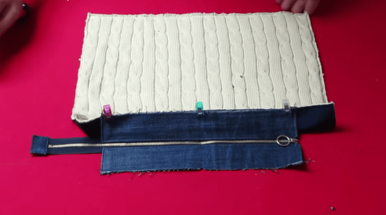 Основой для сумки станут ровные части свитера. В нашем случае размер полотен 38 х 30 см. Удобно то, что по бокам и снизу аккуратно обрезанное полотно не потребует дополнительной обработки.
