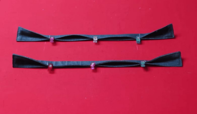 Вырезаем из джинсовой ткани 2 детали 30 х 8 см. Складываем каждую вдвое по всей длине и отутюживаем. Затем прокладываем боковые швы и срезаем внутренние уголки. После выворачиваем и расправляем.