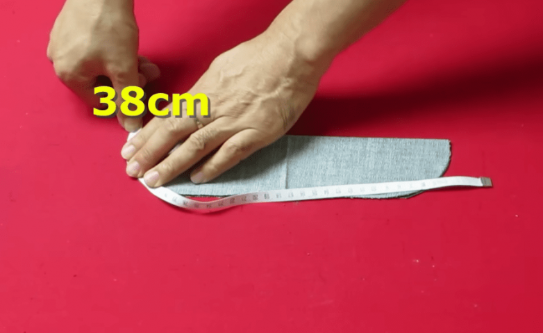 Комбинировать связанное полотно будем с джинсовой тканью. Для донышка берем кусок ткани 28 х 14 см, складываем его вчетверо. В области внешнего угла обозначаем скругление при помощи обычной тарелки подходящего размера, а затем обрезаем лишнюю ткань. Делаем замер половины донышка. Он должен соответствовать ширине вязаного полотнища.