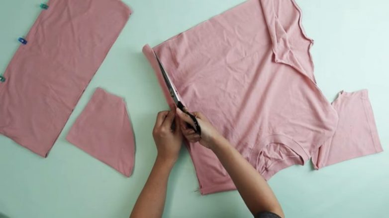 От футболки отрежьте нижнюю часть длиной примерно 20 см — 23 см.
