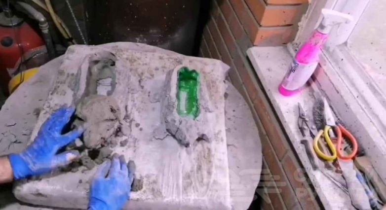 На следующий день откусываем кусочки проволоки в верхней части и снизу. Вырезаем часть бутылок. Потом надо смочить водой черновой слой, и приступаем к дальнейшей лепке цементным раствором.
