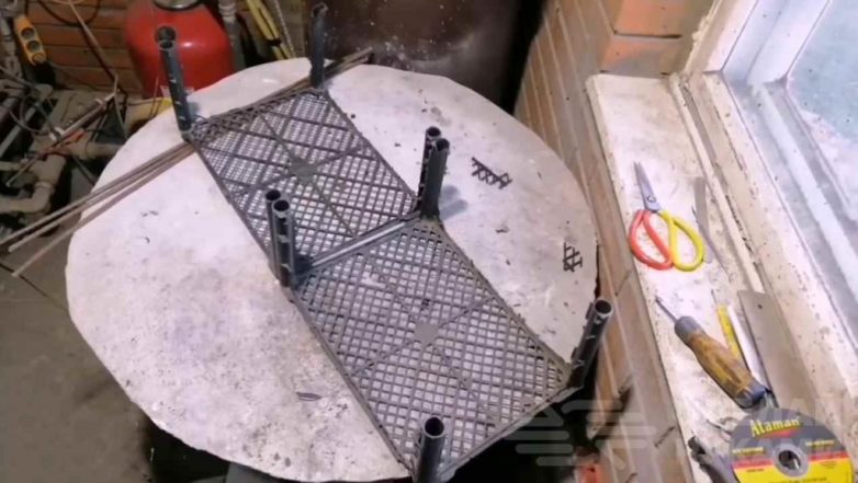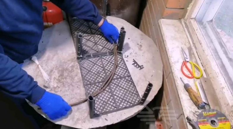 Далее отрезаем три куска стального прутка диаметром 6 мм. Сгибаем их дугой. Крепим заготовки к пластиковому каркасу. Стойки соединяем между собой при помощи проволоки.