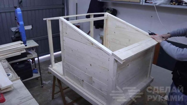 Основные этапы работНа следующем этапе собираем из досок заднюю и боковые стенки будки. После этого приступаем к монтажу крыши.