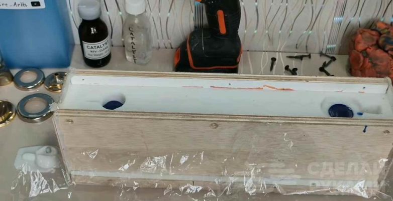 Готовые силиконовые формы для заливки эпоксидной смолы снова помещаем в фанерную опалубку.