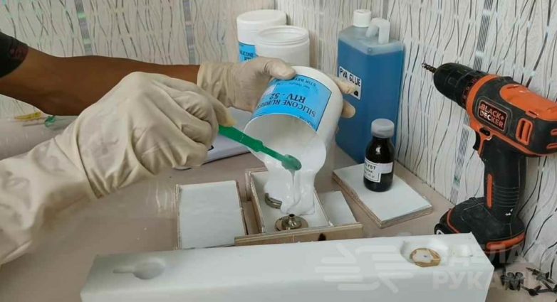 На следующем этапе приступаем к изготовлению формы из силикона, в которую и будет заливаться эпоксидная смола.Смешиваем силиконовую резину (RTV 52) с катализатором (РТВ 52). Затем заливаем этой смесью подготовленные формы из фанеры.