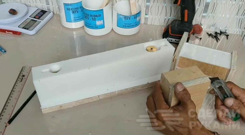 Смешиваем силиконовую резину (RTV 52) с катализатором (РТВ 52). Затем заливаем этой смесью подготовленные формы из фанеры.