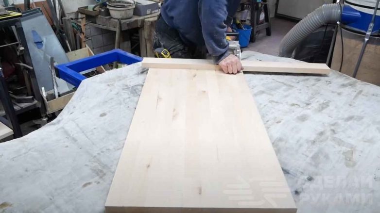 Из досок склеиваем щиты подходящего размера (лучше с небольшим запасом — лишнее потом можно отпилить). Также можно использовать готовые мебельные щиты или фанеру.