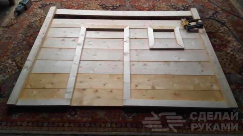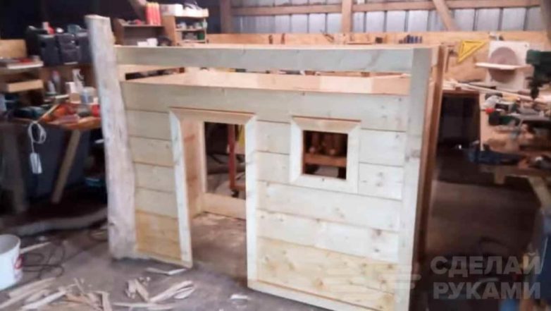 Разбираем каркас и вырезаем в передней (лицевой) части проемы под дверь и окно. Затем покрываем деревянные элементы лаком или минеральным маслом, и собираем.