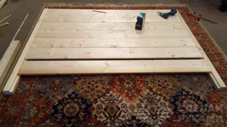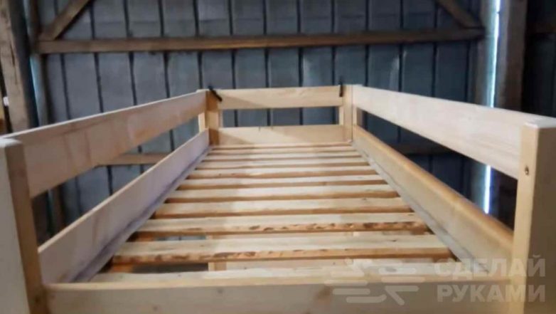 После этого из досок необходимо собрать и установить бортики. Далее на одной из боковых стенок кровати делаем лесенку.