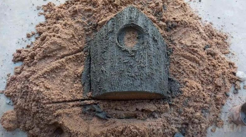 Сначала автор делает подходящую форму из песка. Поливаем ее сверху жидким цементным «молочком». Потом обмазываем более густым цементно-песчаным раствором.
