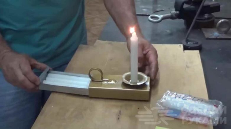 Из обрезков металла можно сделать удобный подсвечник с выдвижным ящичком для хранения запасных свечей.
