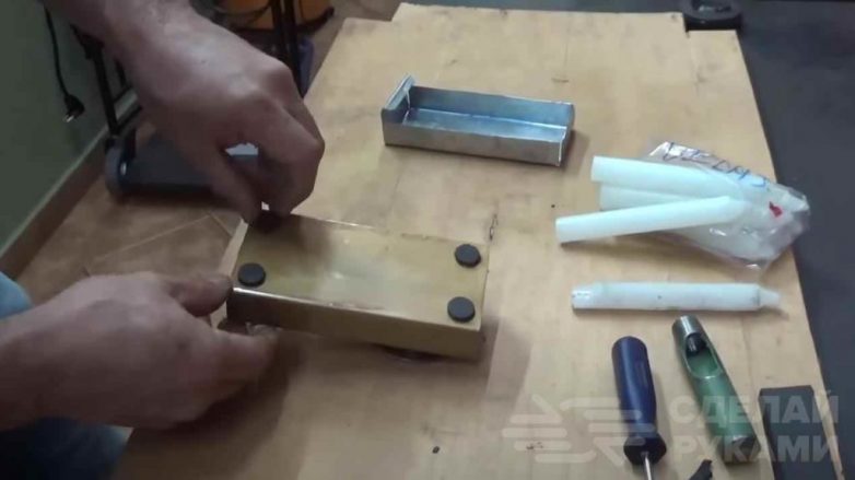 Далее отрезаем кусок тонкого листового металла. Делаем из него ящичек для хранения свечей. Он должен свободно входить в профильную трубу. Потом все красим.