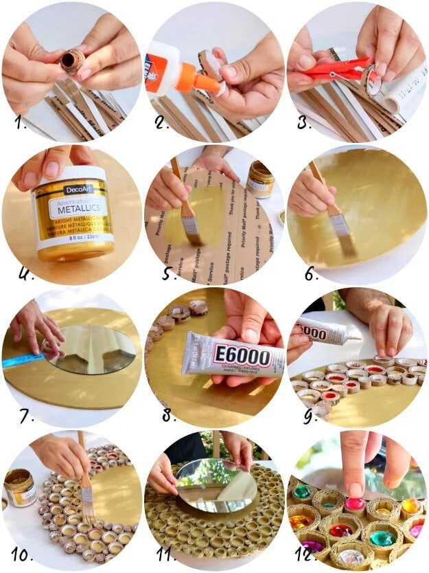 Также из картона вырезать круг, больше зеркала в 2-3 раза. Покрасить картон в желаемый цвет акриловой краской. Ровно в центр, на прочный клей, приклеить зеркало. Вокруг приклеить кольца из картона. Внутрь колец приклеить цветные камни для декора.