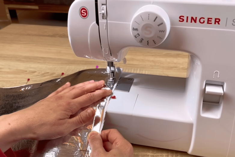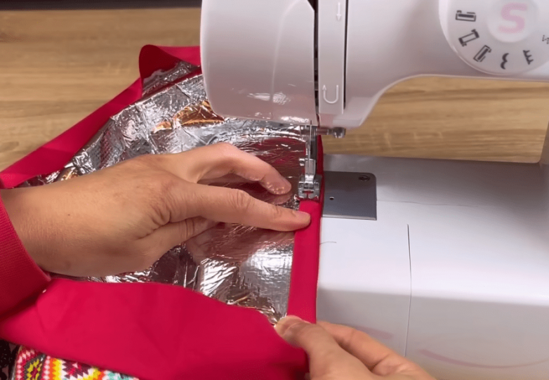 Пришиваем ленту по периметру с тканевой стороны. Затем переворачиваем деталь блестящей стороной внутрь, подгибаем ткань так, чтобы все необработанный край оказался внутри и снова прокладываем строчку.
