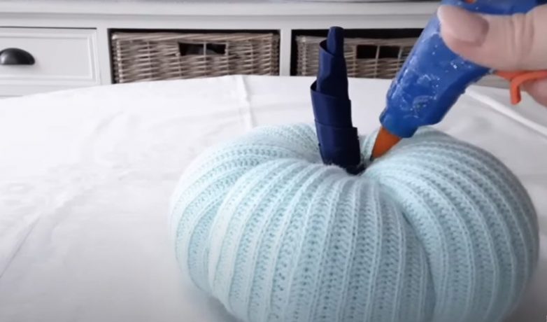Закрепите хвостик в центре тыковки с помощью горячего клеевого пистолета.
