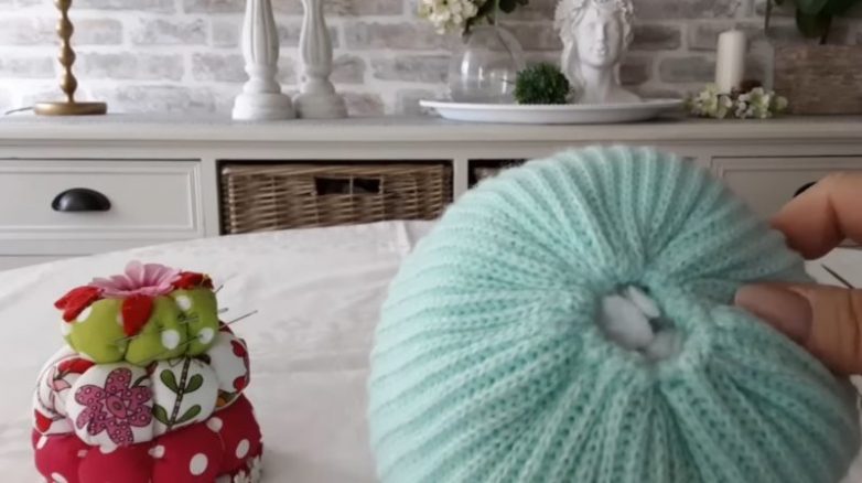 Сшейте отверстие в центре. Аккуратно распределите синтепон внутри заготовки, чтобы придать ей более плоскую форму, похожую на форму тыковки. Закрепите плотную нитку в верхней части заготовки, оберните половину заготовки ниткой, после чего прошейте шапку насквозь, чтобы сформировать «дольку».