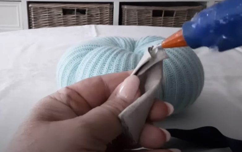 Для изготовления хвостика тыквы понадобится втулка. Сверните ее в трубочку, обрежьте лишнюю часть и обмотайте широкой атласной лентой подходящего цвета.