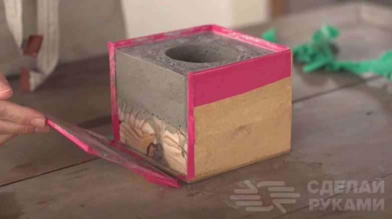 Далее из кусочков ДВП или фанеры собираем короб — форму для заливки. В него вставляем деревянное основание.