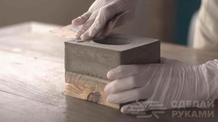После застывания раствора разбираем форму и достаем готовое изделие. Обрабатываем поверхность наждачной бумагой. К основанию приклеиваем ножки. Покрываем все акриловым лаком.