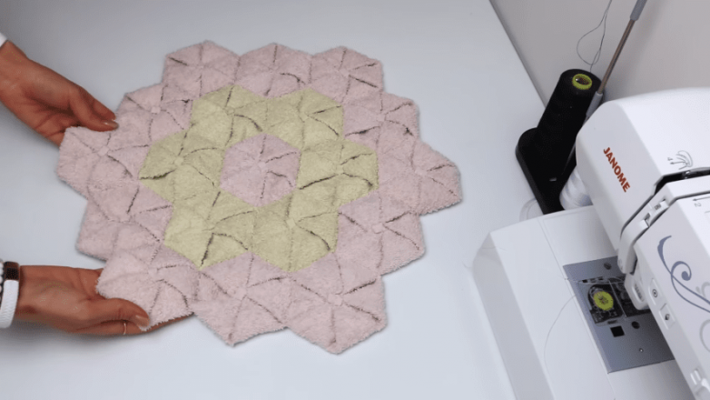 Соты отлично собираются по принципу мозаики. Нужно только выложить заготовки так, чтобы получить интересный рисунок и задать форму будущему коврику. Сшивать соты между собой также удобно. Расположив заготовки лицом внутрь, делаем потайной шов по принципу грань к грани.