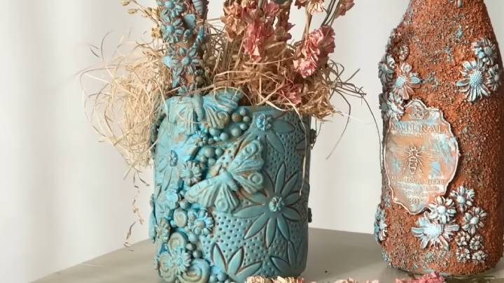 Преобразите стеклянную банку (или даже красивую бутылку, например, от вина) с помощью декора холодным фарфором. Сделать его очень просто, главное — соблюсти пропорцию ингредиентов.