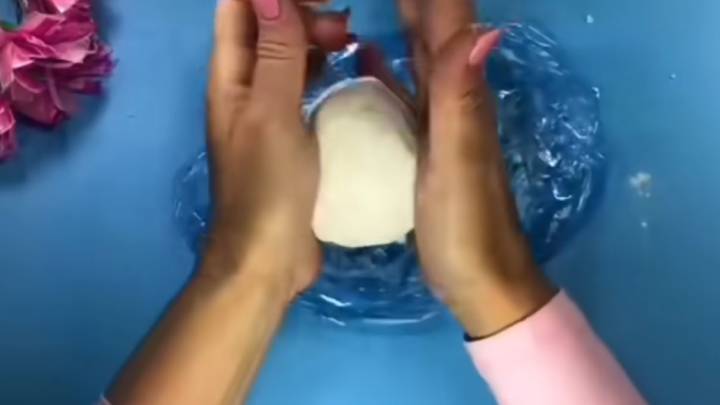 Смешайте все компоненты в пакете до соединения. Затем домесите «тесто» руками. Когда оно соберётся в единый ком, нанесите на руки каплю любого жирного крема (густой консистенции) и раскатайте тесто в пласт. С помощью любой формы придайте интересный узор.